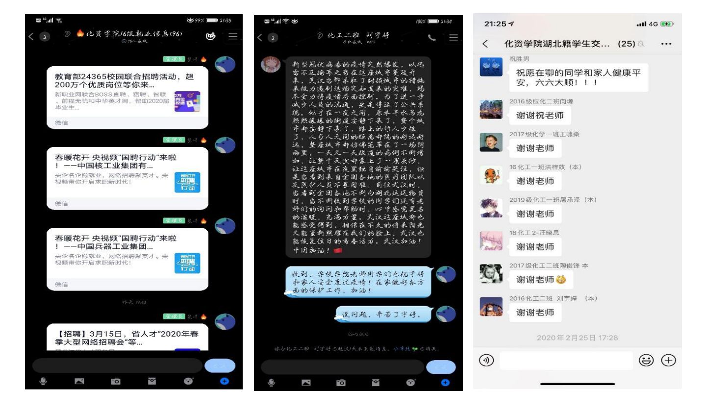 化资学院学生工作组在新冠肺炎疫情防控期间坚持因人施策、因地制宜为学生做好服务、解决学生实际困难。学院建立“在鄂学生微信群”,及时关心关注目前在鄂学生的动态信息,解决在鄂学生学习生活上的实际困难。学院学工组全力帮扶指导应届毕业本科生和研究生普遍关心的考研复试、就业创业等问题,针对存在网络学习困难的学生做好帮扶和资助工作,引导学生养成良好的网络学习习惯,掌握正确的网络学习方法。学院研究生辅导员王金麟老师为保证研究生实验数据安全性,积极对接研究生导师,到研究生寝室为研究生拷贝毕业论文相关实验数据,为学生在家完成论文、顺利毕业保驾护航。学院团委书记、2016级本科生辅导员裴洋老师精准统计毕业生在家撰写毕业论文、准备考研复试面对的实际困难,深入学生寝室,为有需要的同学邮寄电脑、专业课书籍等学习用品。湖北籍学生、2016级化学工程与工艺2班刘宇婷同学说:“疫情期间辅导员老师关心我们的学习生活,为我们解决实际困难,坚定了我们战胜疫情的信心决心。作为一名湖北籍学生,我将听从学校安排,做好个人防护,在家复习好学业,用实际行动助力疫情防控。”
