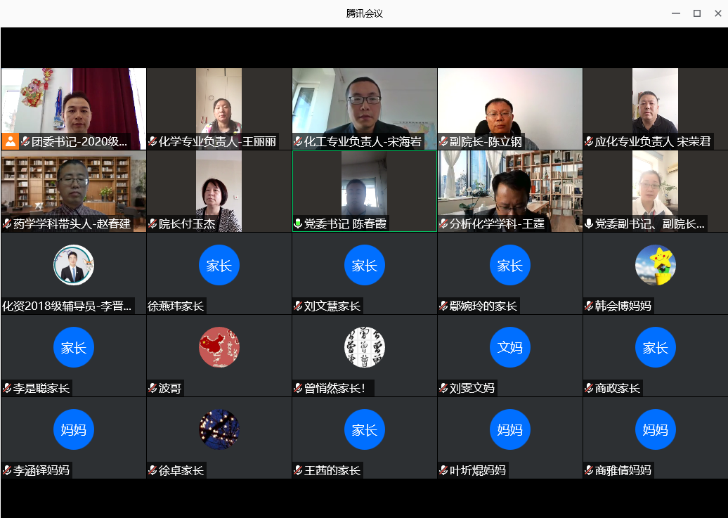 9月14日上午,化学化工与资源利用学院2020级新生家长网络见面会在“云端”顺利举行。学院领导班子、各专业负责人、学科带头人、辅导员出席会议。见面会由学院党委副书记、副院长祝胜男主持。