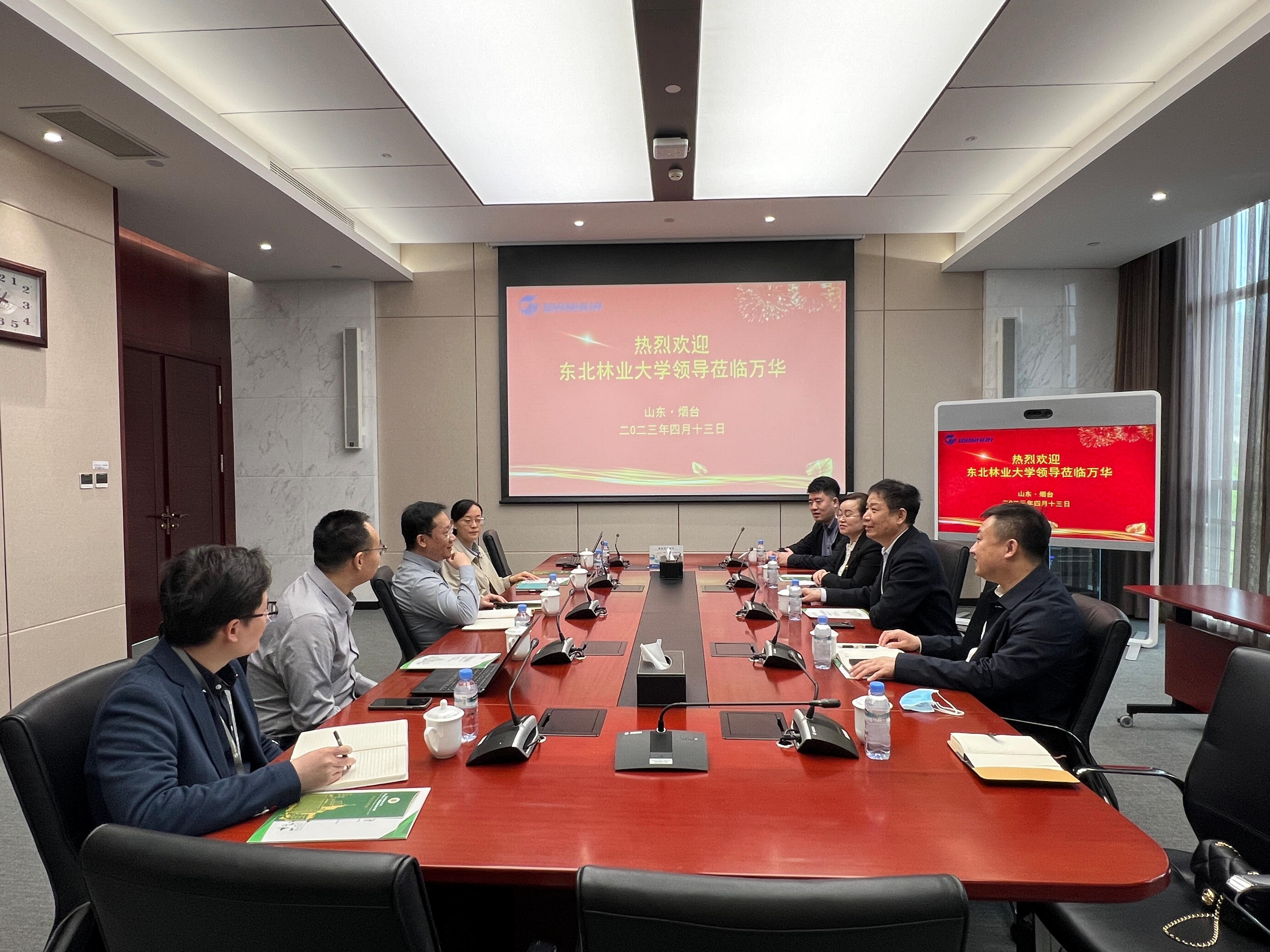 2023年4月13日上午,在山东省烟台市万华化学集团股份有限公司总部,东北林业大学原校长李斌,化学化工与资源利用学院院长陈春霞、党委书记蔡宇、副教授贾涛、辅导员张雪妍一行与万华化学集团股份有限公司招聘经理白朔、人力资源部高明洋、我校校友姜庆梅、王宇等深入交流。李斌表示,学校始终坚持立德树人根本任务,学校在农林医药类大学创新能力培养方面连续五年蝉联第一名,学校坚持以林育人,扎实推动学风建设和人才培养建设。陈春霞介绍了学院学科专业、科学研究、师资力量、毕业就业、创业等情况。白朔向化资学院领导及老师一行表示热烈欢迎,简要介绍了万华化学集团股份有限公司基本情况,带队参观万华大学、中央研究院、磁山工业园、实训中心、展厅等,他表示,很高兴能有机会与东北林业大学化学化工与资源利用学院进行校企合作交流,希望以此次合作为新的突破点,重点围绕校企合作项目、创新基地的建立、人才培养的协同创新、毕业生就业等领域开展深入合作。