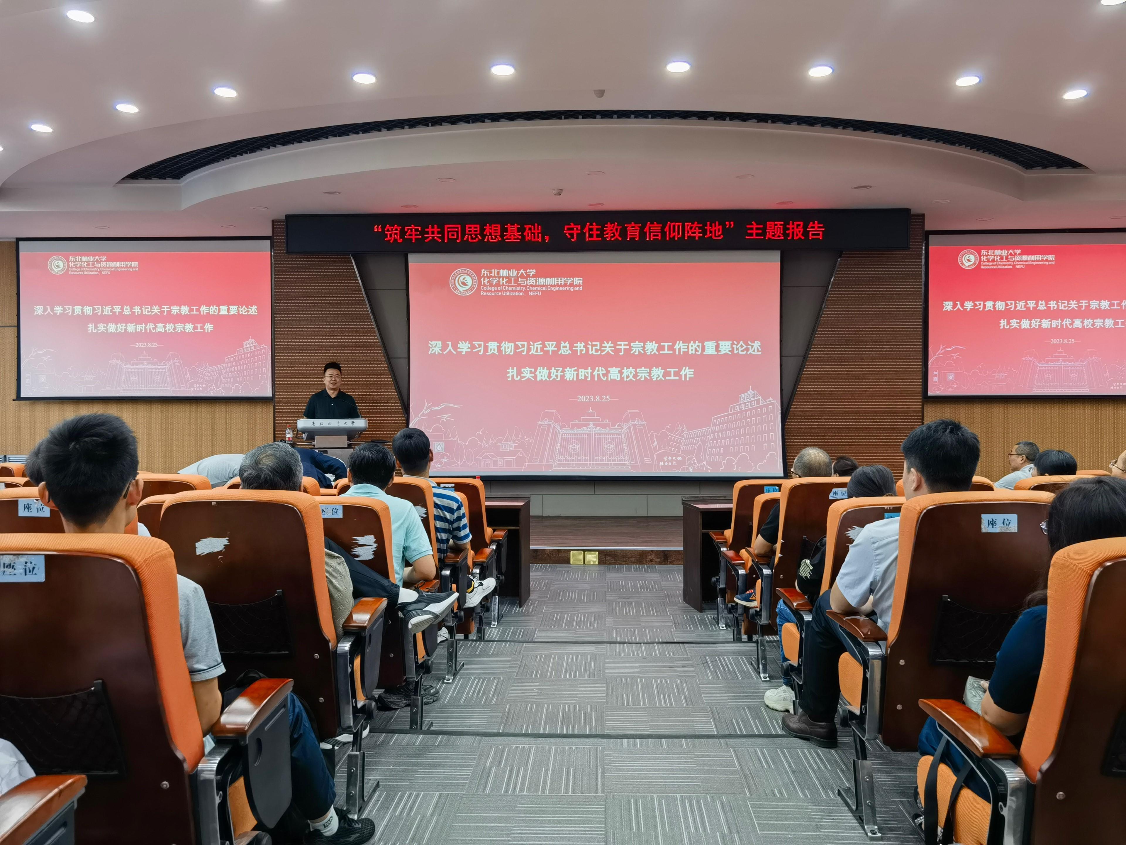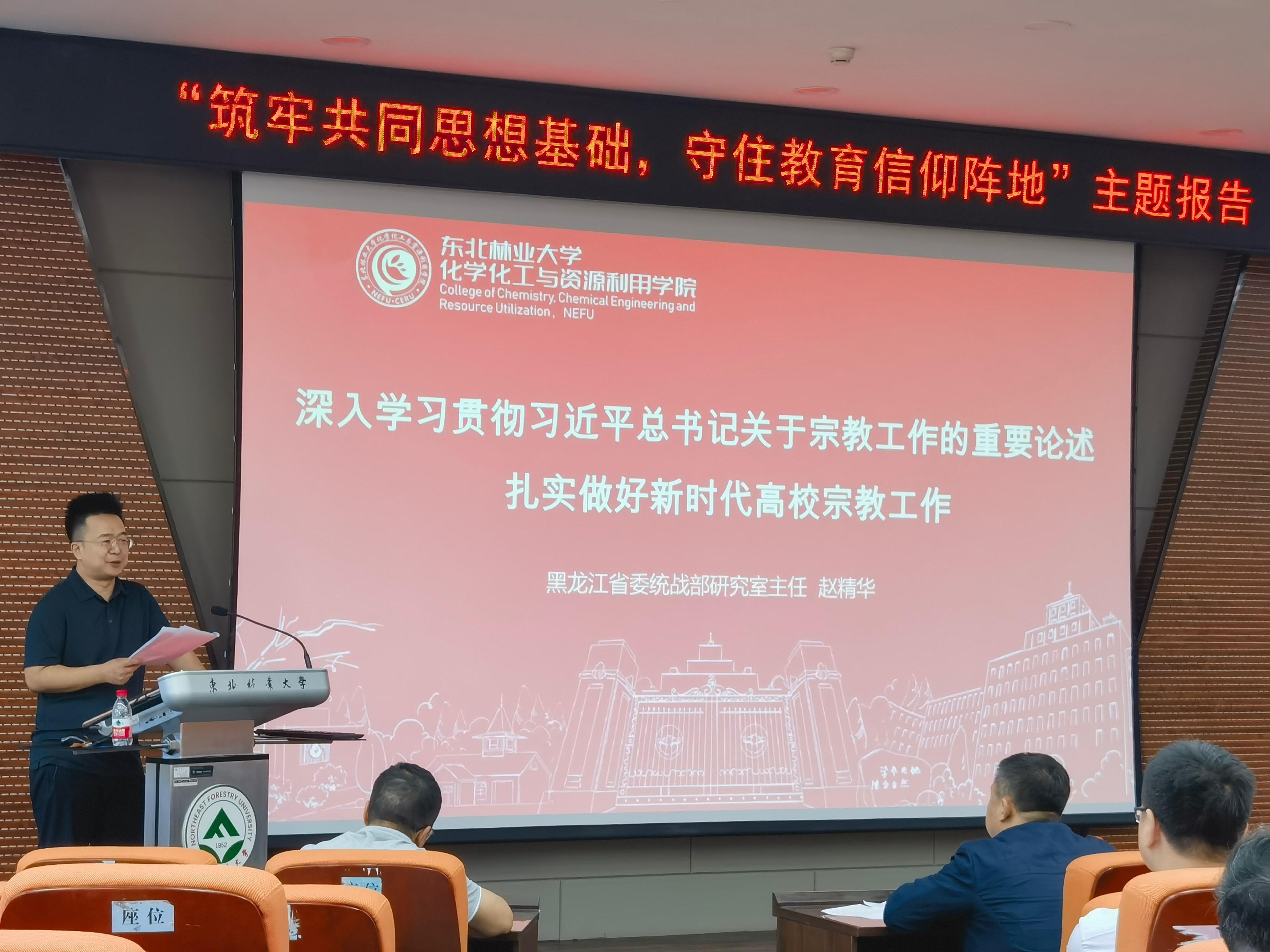 8月25日,为深入推进学习贯彻习近平新时代中国特色社会主义思想主题教育,全面贯彻党关于加强和改进民族宗教工作的重要思想,学院举办“筑牢共同思想基础,守住教育信仰阵地”专题讲座,邀请黑龙江省委统战部研究室主任赵精华同志围绕“深入学习贯彻习近平总书记关于宗教工作的重要论述 扎实做好新时代高校宗教工作”作专题辅导报告。会议由学院党委书记蔡宇同志主持。