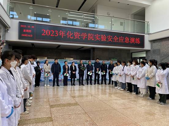 按照学校实验室安全文化月活动安排,10月26日上午化学化工与资源利用学院对2023级研究生进行实验室安全教育,举办危化品泄漏、实验室急救常识、应急灭火等实验室安全应急演练。实验室管理与条件保障处处长王玉龙、副处长刘莉,化学化工与资源利用学院院长陈春霞、书记蔡宇、副院长唐中华、副书记兼副院长王金麟,林学院副院长董利虎、材料科学与工程学院副院长王新政、生命科学学院实验教师代表以及化资学院80余名师生参加演练。陈春霞院长主持演练活动启动仪式。