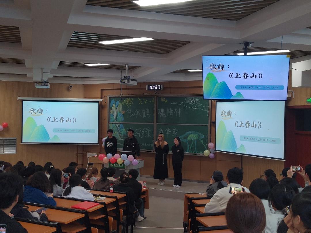 梅欣雨、柯兰欣、魏子贺、龙佳豪同学带来歌曲演唱——《上春山》,这首歌的词曲处处洋溢着万物竞发和勃勃生机的盎然春意,也让我们不禁憧憬着绿色中国的美好春光。在美妙的歌声中,本次政治观摩会圆满落幕。
