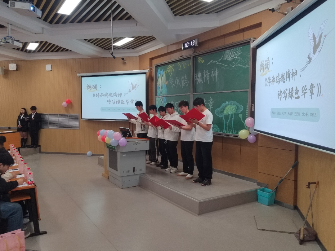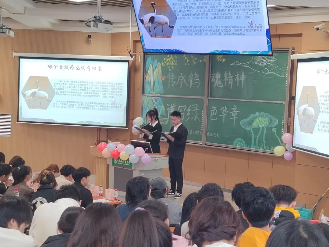 接下来主持人带领同学们走出故事表面,剖析学习其深度精神内涵。进行活动第二部分——鹤魂精神。任彦臣,宋宏明,王海瑭,王鹏锟,牟韩磊,刘杰豪同学带来诗朗诵:《传承鹤魂精神,谱写绿色华章》。通过六位同学声情并茂的朗诵,同学们对“鹤魂精神”这一概念和成果有了进一步的了解,鹤魂精神是对自然的热爱和保护,是梦想与追求,徐秀娟的故事勾勒出新一代青年人美好纯洁的梦想,以及他们为实现梦想不断付出,甚至不惜付出自己宝贵生命的高贵品质,是无私奉献的精神,通过徐秀娟的例子,我们看到了主人公无私奉献的精神,这种精神与鹤的高洁品性相结合,达到了“天人合一”的中国美学高度,是坚持与毅力:徐秀娟的故事还告诉我们,无论遇到多大的困难和挑战,都要坚持自己的信念和目标,正如她所说的“一个脚步两个踪,不能遇苦败下阵来”。