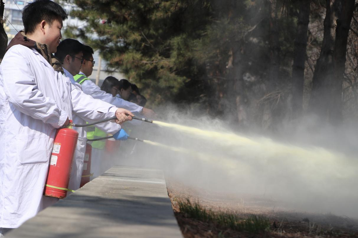 演练中,师生参与互动环节,体验干粉灭火器、水基灭火器的使用。