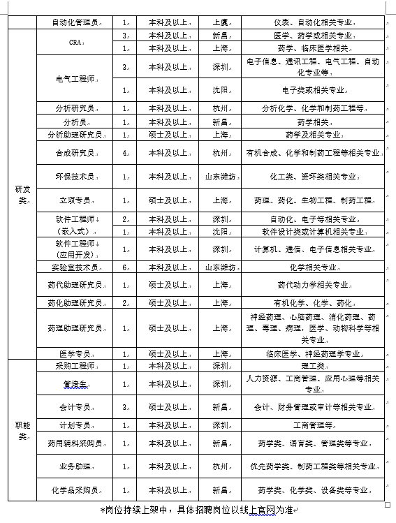 药学类、制药工程类、化工类、化学类、生物类、生物医学工程、财会类、计算机、环境工程、安全工程、机电自动化类、市场营销、国际贸易等